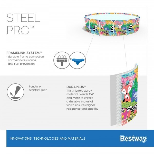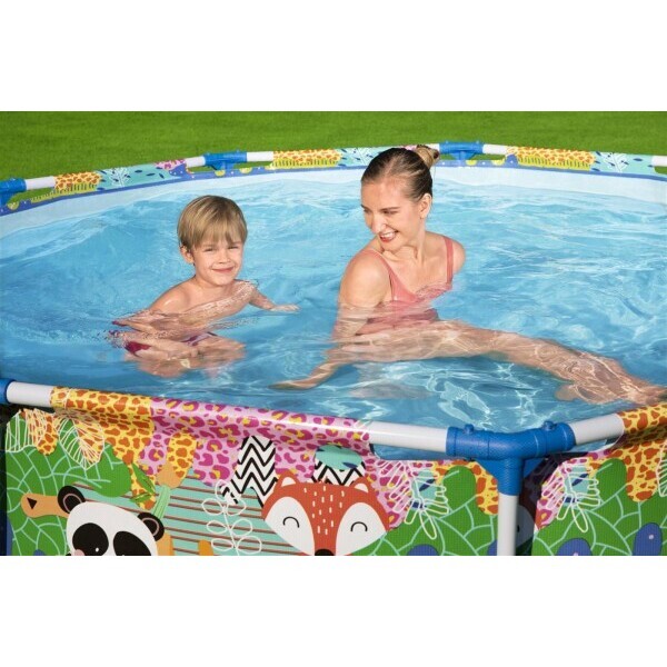 Каркасный бассейн Bestway 5612F отличается яркой расцветкой. Чаша выполнена из высококачественного трехслойного ПВХ: два слоя плотного винила и между ними сетка из полиэстера для особой прочности. Цвет чаши бассейна снаружи разноцветный с элементами джунглей и диких животных. Каркас металлический, покрытый предотвращающим появление коррозии слоем пластика.