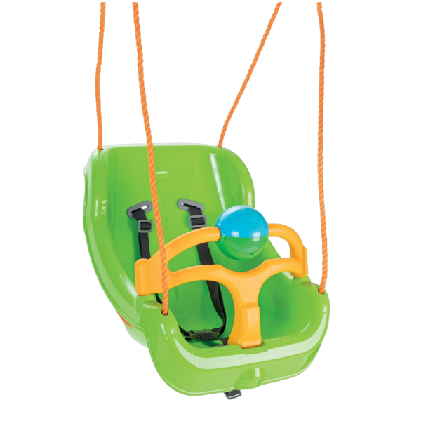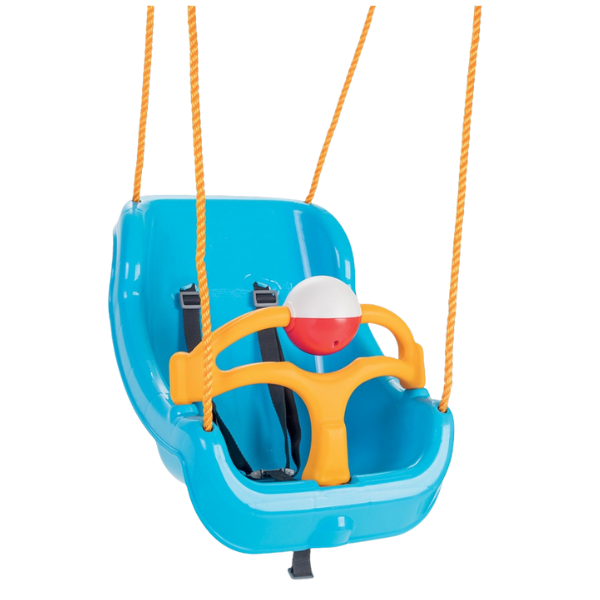 Сиденье для качелей ”Big swing” рекомендуется для детей от 1 года и состоит из двух основных деталей — это спинка и съёмный ограничитель (на нем расположена погремушка), для большей безопасности предусмотрены трёхточечные ремни. Также в комплекте с сиденьем идут гибкие подвесы из синтетических верёвок с карабинами.