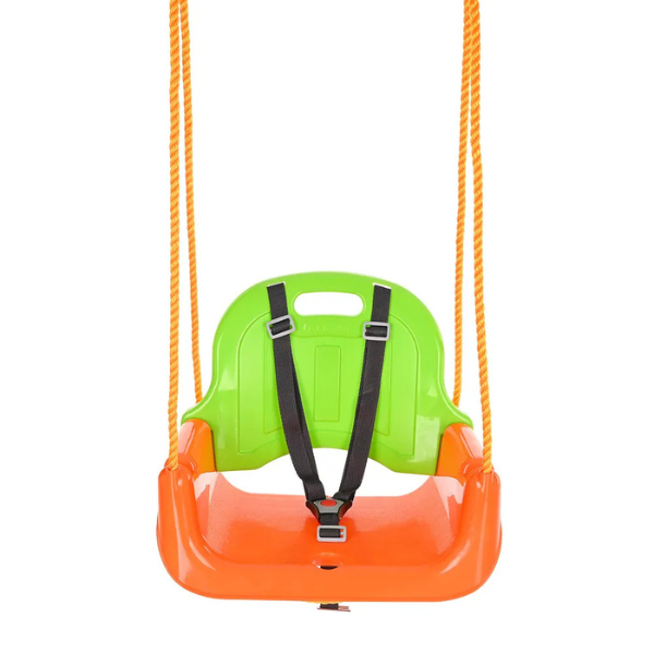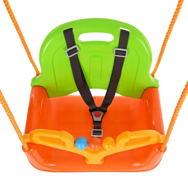 Подвесные качели «Samba» для детей от 1 года, трансформируются по мере роста ребенка. От 1 до 3-х лет — со спинкой и ограничителем (на нем расположены погремушки), для большей безопасности предусмотрены трёхточечные ремни. После 3-х лет снимается ограничитель, а после 5-ти лет снимается спинка.