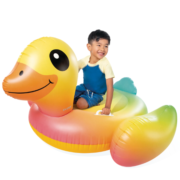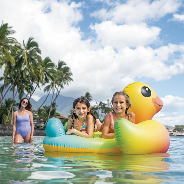 Плавать с уточкой теперь можно не только в ванной, но и в бассейне, и даже в море. Размеры надувного плотика: 147х147×81см. Есть удобные ручки, чтобы держаться. Легко накачивается ручным насосом Intex 68613.