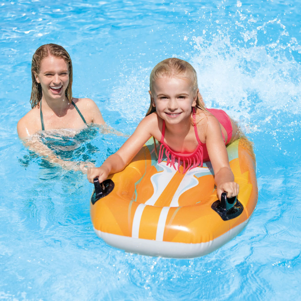 Этот яркий и жизнерадостный плотик станет прекрасным другом и помощником в играх для вашего ребенка. Вы можете играть в серферов, охотников на акул или представить, что вы саночники, даже жарким летом. Он отлично подойдет для первых знакомств ребенка с открытыми водоемами. Две удобные ручки позволят ему крепко держаться на плоту и не испытывать дискомфорта.