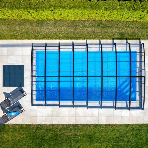 Продолжение направляющих рельсов обеспечивает дополнительный комфорт, позволяя максимально использовать всю полезную площадь бассейна и обеспечивая доступность ко всем его сторонам. Стандартная длина направляющих рельсов соответствует размеру павильона и идеально подходит для маленького сада с бассейном. Все павильоны оснащены направляющими рельсами с обеих сторон, обеспечивая полную функциональность и удобство использования. Длина направляющих рельсов точно соответствует общей длине павильона.