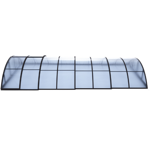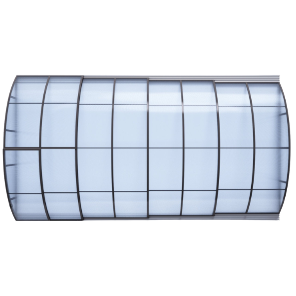 Продолжение направляющих рельсов обеспечивает дополнительный комфорт, позволяя максимально использовать всю полезную площадь бассейна и обеспечивая доступность ко всем его сторонам. Стандартная длина направляющих рельсов соответствует размеру павильона и идеально подходит для маленького сада с бассейном. Все павильоны оснащены направляющими рельсами с обеих сторон, обеспечивая полную функциональность и удобство использования. Длина направляющих рельсов точно соответствует общей длине павильона.