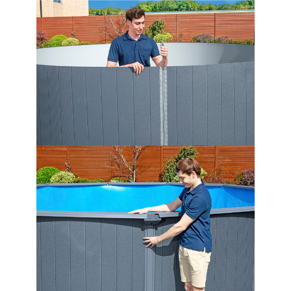 Pereții piscinei: TriTech – material rezistent, cu trei straturi. Este compus dintr-o plasă din poliester încadrată între două straturi de PVC armat, oferind rezistență sporită la întindere, durabilitate și confort.