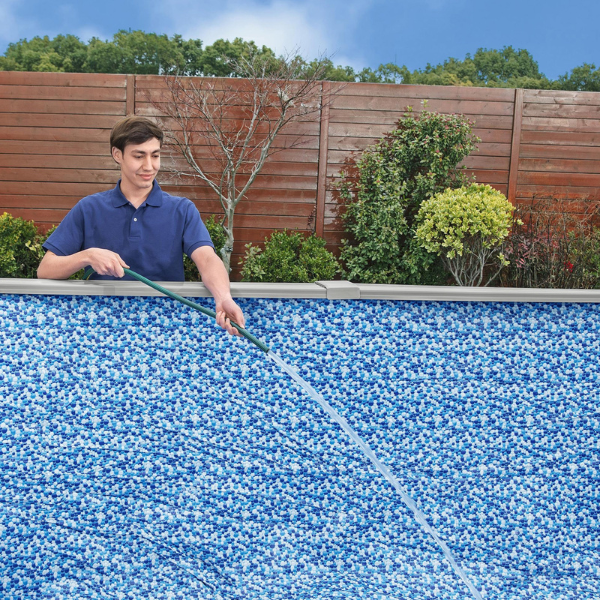 Interiorul piscinei este realizat din PVC de înaltă calitate, cu protecție UV și finisaj decorativ tip pietriș, oferind o senzație plăcută la atingere și un aspect elegant. Culoarea gri granit a pereților exteriori se integrează armonios în orice peisaj, iar marginea foarte lată asigură confort și siguranță în utilizare. Skimmerul de suprafață integrat curăță eficient apa de frunze și impurități.