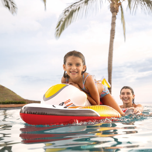 Jucăria gonflabilă „Hydroscooter” este un adevărat vehicul pe apă pe care copilul îl poate controla singur. Pluta în formă de hydroscooter va adăuga distracție jocurilor de apă, va stimula imaginația și îl va învăța pe micuț să își mențină echilibrul. Siguranța este garantată: mânerul din cauciuc gros asigură o prindere fermă, prevenind alunecarea mâinilor copilului în momentele critice.