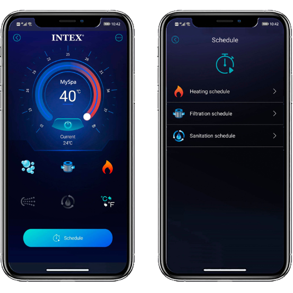 Încălzitorul încorporat permite reglarea temperaturii apei între 20°C și 40°C, cu o viteză de încălzire de 1,8–3,0°C/oră. Sistemul de filtrare, cu un debit de 1.741 l/oră, menține apa curată, iar sistemul integrat de dedurizare face apa mai blândă pentru piele.